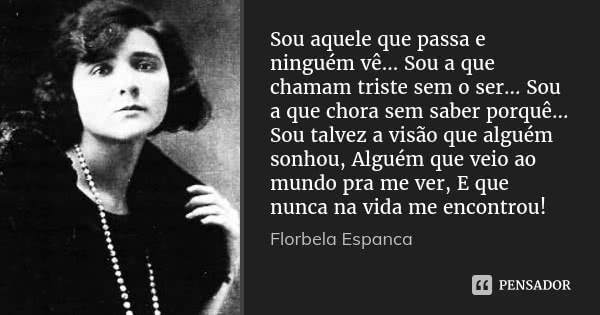 Florbela Espanca (1894-1930) foi uma poetisa portuguesa, autora de sonetos e contos importantes na literatura de Portugal. Foi uma das primeiras feministas de Portugal. Sua poesia é conhecida por um estilo peculiar, com forte teor emocional, onde o sofrimento, a solidão, e o desencanto estão aliados ao desejo de ser feliz.